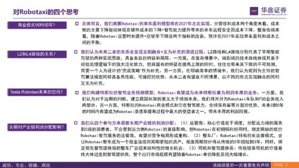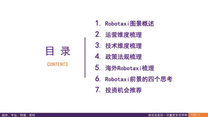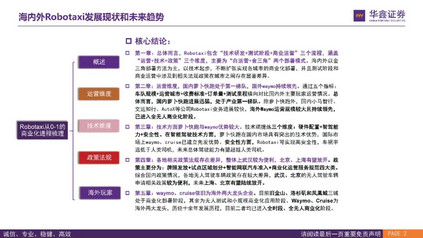 第一章:总体而言,Robotaxi包含“技术研发+测试阶段+商业运营”三个流程,涵盖“运营+技术+政策”三个维度,主要为“自运营+金三角”两个部署模式。海内外以金三角部署方法为主,以技术起步,不断扩张实现各城市的商业化部署,并且测试阶段和商业运营中涉及到相关法规政策在城市之间存在显著差异。 第二章:运营维度,国内萝卜快跑处于第一梯队,国外waymo持续领先。通过五个指标:车队规模+运营城市+收费标准+订单量+测试里程横向对比国内外主要玩家运营情况。总体而言,国内萝卜快跑进展迅猛,处于产业第一梯队。除萝卜快跑外,国内小马智行、文远知行、AutoX等公司Robotaxi业务进展较快,海外Waymo运营规模较大且持续领先,已进入全无人商业化阶段。 第三章:技术方面萝卜快跑与waymo优势较大。技术端提炼三个维度:硬件配置+智驾能力+安全性。在智能驾驶技术方面,萝卜快跑在国内市场具有突出的技术优势,国际市场上waymo、cruise已建立先发优势。安全性方面,Robotaxi可实现高安全性,车祸率远低于人类司机,未来总体驾驶能力有望超越人类司机。 第四章:各地相关政策法规存在差异,整体上武汉较为便利,北京、上海有望放开。政策主要分为:牌照发放+试点区域划分+智能网联汽车准入+商业化运营服务规范四大类。综合国内政策情况,各地无人驾驶车辆政策存在较大差异,武汉、北京的无人驾驶车辆申请相关政策较为便利,未来上海、北京有望陆续放开。 第五章:waymo、cruise依旧为海外两大龙头企业。目前旧金山、洛杉矶和凤凰城三城处于商业化部署阶段,其余为无人测试和小规模商业化应用阶段。Waymo、Cruise为海外两大龙头,历经十余年发展历程,目前二者均已进入全时段、全无人商业化阶段。 总体而言,我们测算Robotaxi的单车盈利模型将在2027年左右实现。分营收和成本两个角度来看,成本侧的主要下降驱动体现在硬件成本的下降+智驾能力提升带来的单车远程安全员成本下降。整营收端来看,随着Robotaxi运营时长提升+空驶率下降这两个指标的改善,预计在2027年实现单车盈利和成本之间的平衡。 我们认为未来二者的关系会呈现互相融合+互为补充的演进过程。L2路线和L4路线分别代表了早期智能驾驶的两种实现思路,具备各自的特征和局限:一方面,在复杂情景中,端到端的技术路线体现其基于经验处理逻辑下的强大泛化能力,但其固有的特征在提高上限的同时,往往也带来其下限的不可预测,需要一个人为设计的“兜底策略”作为补充。另一方面,在明确简单的情境中,我们认为规则为主导的智驾算法模型同样具备高性能,可操控的优势。未来二者有望在不同情景,以不同的形式实现融合的同时又互为补充。 我们构建特斯拉的智驾业务预测模型,Robotaxi有望成为未来特斯拉最为利润丰厚的业务。一方面,我们认为对于远期的判断,建立跟踪框架的意义大于预测本身,我们将其分为Robotaxi车队和FSD业务收入两部分。另一方面,特斯拉的Robotaxi商业模式和它在智驾能力、全球保有量等方面的优势,未来3到5年的时间内有望成为Robotaxi渗透率提高过程中最大的受益者之一,带来丰厚的利润回报。 我们从四个参与方来观察长期产业链的利润分配:(1)运营商:核心价值在于调度,分配运力端的服务到C端的消费者,不会受到运力侧Robotaxi的直接影响,但Robotaxi在初期拐向好用时,绑定稀缺的低价Robotaxi智驾服务的运营商,有望对竞争格局形成重构。(2)整车厂:Robotaxi特有的长运营模式,会让Robotaxi整车成为一个现金流收回周期更短的资产,报废周期预计将从传统的5年缩短到3年。同样,绑定领先智驾提供商的整车厂会迎来结构性的增长机会。(3)司机和智驾提供商:传统链条司机的价值最终大体过度到智驾提供商,整个出行市场规模有望随着Robotaxi单价降低呈现大幅增长。