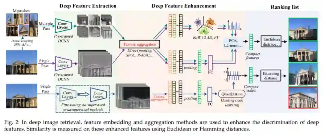 通过特征增强来提高深度特征的判别能力。直接使用深度网络[17]同时训练聚合特征;另外,特征嵌入方法包括BoW[63]、VLAD[64]和FV[65]将局部特征嵌入到全局特征中。这些方法分别使用深度网络(基于codebook)或联合(无codebook)进行训练。另外,采用哈希方法[18]将实值特征编码为二进制码,提高检索效率。特征增强策略会显著影响图像检索的效率。