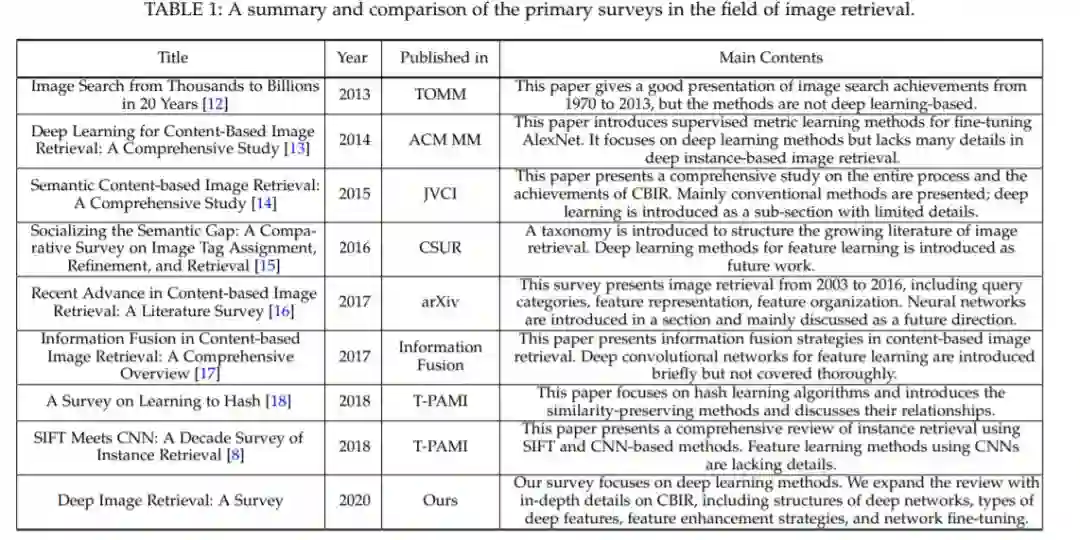[1, 2, 8]对传统图像检索方法进行了优秀的研究。相比之下,本文侧重于基于深度学习的方法,我们的工作与其他发表的综述[8,14,15,16]比较如表1所示。图像检索的深度学习包含了如图2所示的关键阶段,为了提高检索的准确性和效率,已经提出了针对一个或多个阶段的多种方法。在本综述中,我们对这些方法进行了全面的详细介绍,包括深度网络的结构、特征融合、特征增强方法和网络微调策略,动机是以下问题一直在推动这一领域的研究: