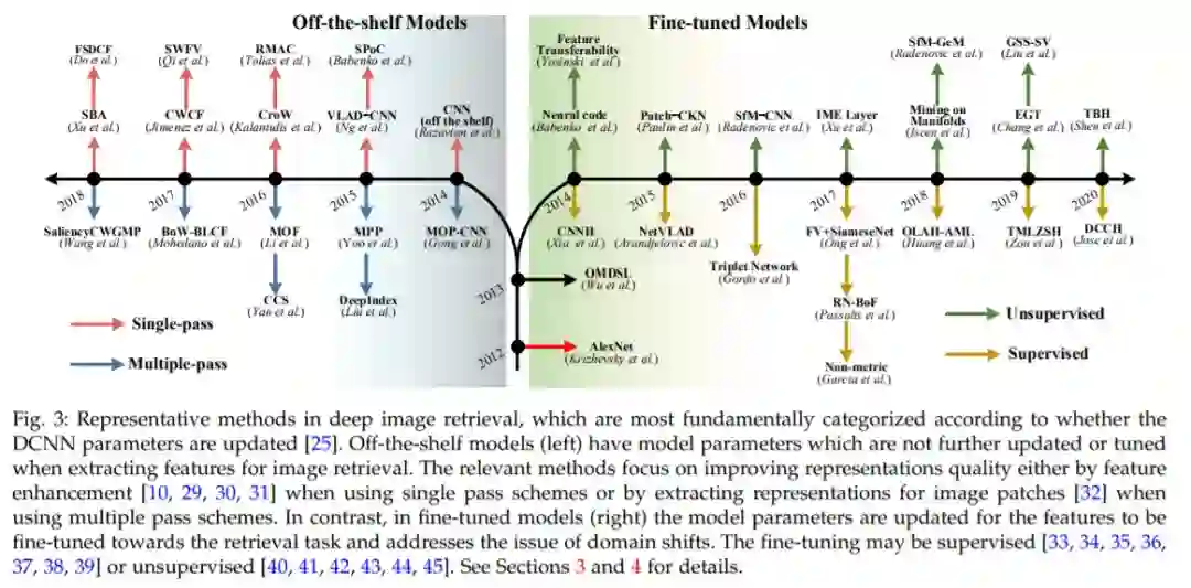 在基于AlexNet[20]的图像检索实现非常成功之后,对检索任务的DCNNs进行了重要的探索,大致沿循了上述三个问题。也就是说,DCNN方法被分为(1)现成的模型和(2)经过微调的模型,如图3所示,并并行处理(3)有效的特征。DCNN是现成的还是微调的,取决于DCNN的参数是[25]更新还是基于参数固定的DCNN[25,26,27]。对于特征图,研究人员提出了R-MAC[28]、CroW[10]、SPoC[7]等编码和聚合方法。