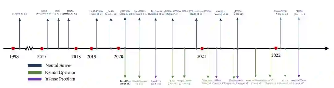 **第三,基于物理的机器学习的任务是什么? **从基于物理的机器学习的定义中,我们看到它也适用于纯统计机器学习的问题设置,如监督学习、无监督学习、半监督学习、强化学习等。然而,一个基本条件是,基于物理的机器学习问题必须涉及现实世界的物理过程,而我们必须对此有所了解。否则,它就退化为纯粹的统计学习。现有的工作可分为两类,即利用PIML解决科学问题和结合物理先验解决传统机器学习问题。在本文中,我们将分别讨论这些应用。第一堂课,人类掌握了丰富而精确的物理定律来描述科学现象,通常用微分方程来表示。目前,PIML领域在科学问题上有更多的进展,我们将在总结方法时重点介绍。具体来说,这些问题大致可以分为两类:物理系统的神经模拟(包括神经求解器和神经算符)和逆问题(如逆设计和科学发现)。神经模拟的目的是利用物理知识和可用数据预测或预测系统的状态。例如,求解PDE系统、预测分子性质和预测未来的天气都可以被视为正向问题。相反,逆问题的目标是找到一个满足数据或给定约束的物理系统,例如,从数据中科学发现PDE, PDE系统的最优控制等。我们总结了近年来提出的工作,按时间顺序排列,如图2所示。在第二节课中,结合物理知识可能会显著帮助提高在许多计算机视觉和强化学习任务中的表现。在这些领域中,物理知识比精确的微分方程更加模糊和难以表示。对称和直观的物理约束更常被用作增强机器学习模型的物理先验。