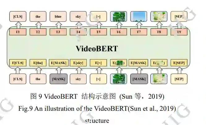 Sun 等人(2019b)提出的 VideoBERT 模型是第 一个将 Transformer 结构拓展到视频语言预训练的 工作,模型结构如图 9 所示。对 ASR 得到的文本输 入采取常用的类 BERT 处理,对于视频输入,按每 秒 20 帧采样速度从视频剪切多个 1.5s 视频片段, 应用预训练过的 S3D 提取视频特征,然后采用层级 k 聚类(hierachical k-means)标记视觉特征,以聚类 中心对视频特征进行矢量量化(vector quantization, VQ)操作。文本与视频的联合特征被送入多模态 Transformer进行MLM,VTM和掩蔽视频预测(video only mask completion, VOM)预训练任务。VOM 以 聚类的视频片段作为被掩蔽和预测的视觉单元。模 型目标是学习长时间高级视听语义特征,如随时间 推移而展开的事件与动作,采用网络收集的厨艺教 学视频作为预训练数据,在预设下游任务上表现良 好,但由于视觉中心代表的视觉信息难以全面描述 视频内容,使得模型的泛化性受到一定限制。