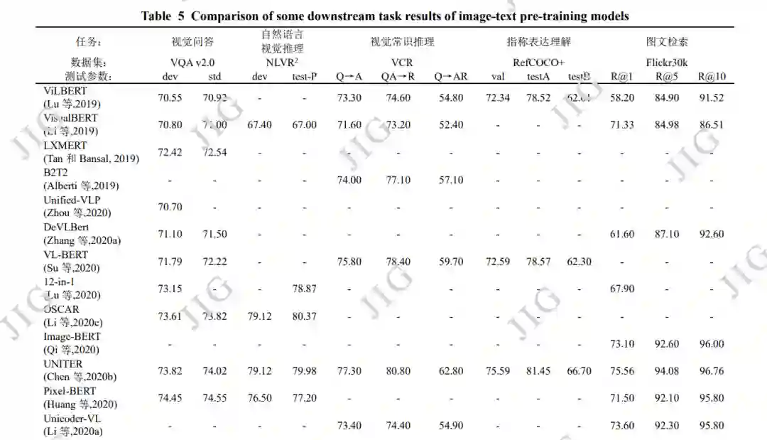 图像-文本多模态下游任务繁多,代表性的任务 有分类任务如视觉问答(Johnson 等,2017;Hudson 和 Manning,2019)),自然语言视觉推理(natural language visual reasoning, NLVR)(Suhr 等,2017, 2018),视觉常识推理(Gao 等,2019);指称表达理解(referring expression comprehension, REC)(Yu 等, 2016b;Mao 等,2016),视觉蕴含(visual entailment, VE)(Xie 等,2018a,2019)等,检索任务如图文检 索(image-text retrieval)(Karpathy 和 Li,2015; Plummer 等,2015;Lee 等,2018);生成任务如图 像描述(Vinyals 等,2015;Xu 等,2015;Anderson 等,2018),新对象图像描述(novel object captioning, NoCaps )( Agrawal 等 , 2019 ) 及 多 模 态 翻 译 (multimodal translation)(Elliott 等,2016)。如下对 表 5 中 VLP 模型所进行对比的下游任务与相关数据 集进行进一步介绍。