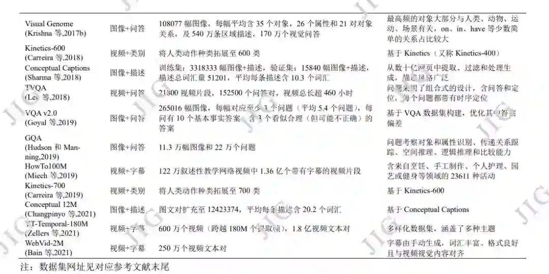 在各类预训练任务中,模型性能受预训练数据 集质量的影响显著。为了获取通用的多模态知识, 视觉-语言预训练任务主要使用带有弱标签的视觉语言对进行模型训练。图像-文本任务主要为图像及 标题、内容描述、人物的动作描述等。类似地,视频 -语言预训练数据集包含大量的视频-文本对,其标签 来源包括视频中的文字描述以及由自动语音识别 (automatic speech recognition, ASR)技术获得的文 本信息等。部分模型为针对性提升某一模态的表征 提取能力,在多模态预训练之外还进行单模态数据 集进行预训练,使用如图片数据集与纯文本数据集。 预训练中常用的公开数据集有,图文数据集 SBU(Ordonez 等,2011),Flickr30k(Young 等, 2014),COCO Captions(Chen 等,2015),Visual Genome(VG)(Krishna 等,2017b),Conceptual Captions (CC, CC3M)(Sharma 等,2018)和 Conceptual 12M (CC12M)(Changpinyo 等,2021),VQA(Antol 等, 2015),VQA v2.0(Goyal 等,2019),Visual7W(Zhu 等,2016),GQA(Hudson 和 Manning,2019)。视 频数据集 TVQA(Lei 等,2018),HowTo100M(Miech 等,2019),Kinetics(Kay 等,2017),Kinetics-600 (Carreira 等,2018),Kinetics-700(Carreira 等, 2019),YT-Temporal-180M(Zellers 等,2021),WebVid-2M(Bain 等,2021)。单模态图片数据集 COCO (Lin 等,2014),OpenImages(Krasin 等,2017), 文本数据集 BooksCorpus(Zhu 等,2015)以及 English Wikipedia。数据集信息汇总如表 1 所示,以下对代 表性的数据集做进一步介绍。