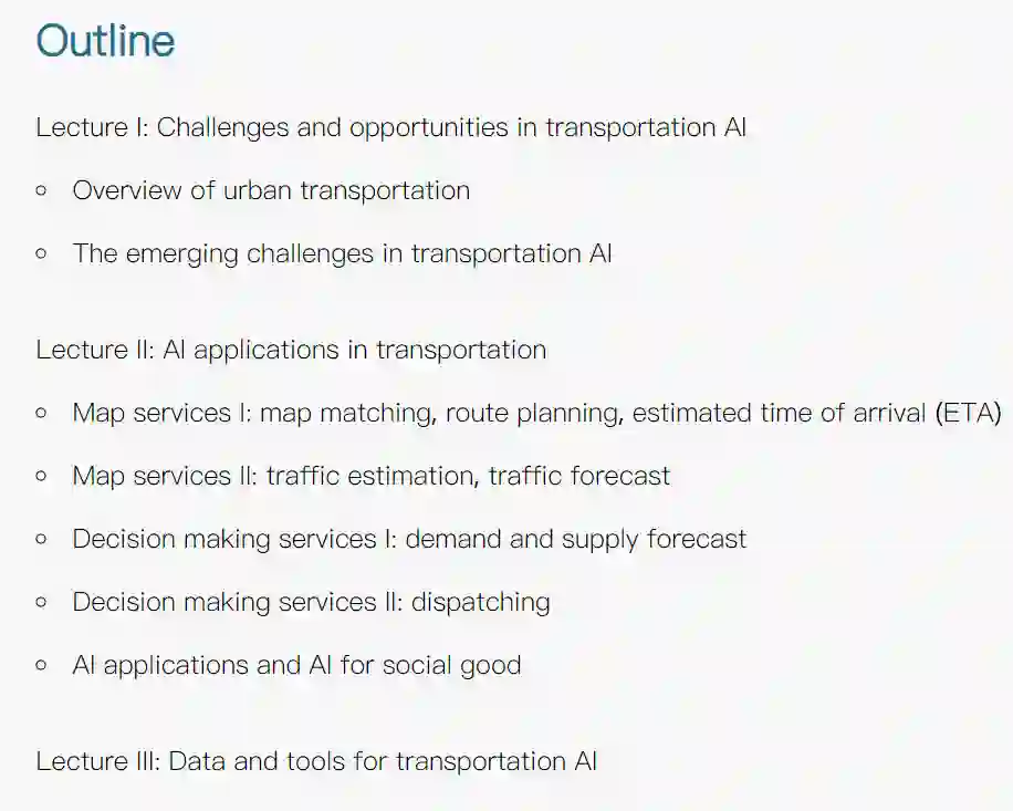 交通是生活的基本必需品。在人类历史上,探索更好的交通方式从来没有停止过。近年来,拼车行业的革命和自动驾驶技术的创新每天都产生大量的交通数据。如此庞大的数据量开启了现代智能交通的新时代。许多传统的交通问题可以通过现代机器学习和数据挖掘方法找到更好的解决方案。本教程的目的是为参与者提供一个广泛和全面的基础,最近的发展和交通AI的开放问题。