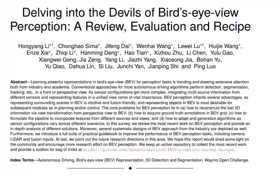 从鸟瞰视角学习感知任务中的强表示是当前业界和学术界广泛关注的一个趋势。大多数自动驾驶算法的传统方法都是在正面或透视视图中执行检测、分割、跟踪等。随着传感器配置越来越复杂,集成来自不同传感器的多源信息并在统一视图中表示特征变得至关重要。BEV感知继承了几个优点,因为在BEV中表示周围的场景是直观的和友好的融合;和在BEV中表示对象是最可取的后续模块,如规划和/或控制。BEV感知的核心问题在于: (a) 如何通过透视视图到BEV的视图转换重建丢失的三维信息; (b)如何获取BEV网格中的真实注释; (c)如何制定整合不同来源和不同观点特色的途径;以及(d)当传感器配置在不同场景中不同时,如何适应和推广算法。本综述回顾了关于BEV感知的最新工作,并对不同的解决方案进行了深入分析。此外,还描述了业界对BEV方法的几种系统设计。此外,我们还介绍了一整套实用指南来提高BEV感知任务的性能,包括相机、激光雷达和融合输入。最后,指出了该领域未来的研究方向。我们希望这份报告能对社区有所启发,并鼓励对BEV感知进行更多的研究。我们有一个活跃的存储库来收集最新的工作,并在 https://github.com/OpenPerceptionX/BEVPerception-Survey-Recipe上提供了一个工具箱。
