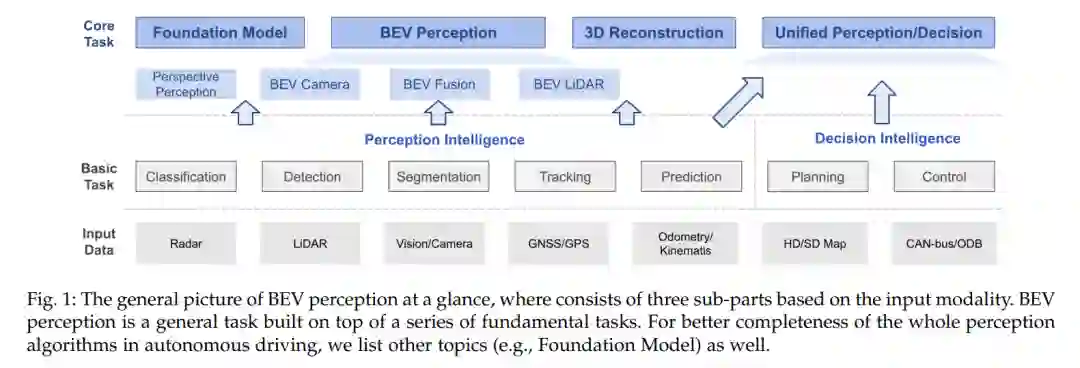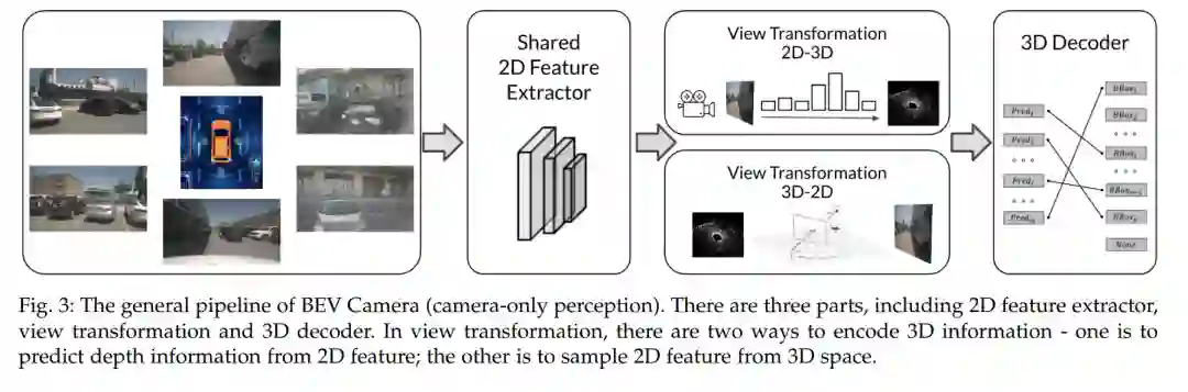 在本研究中,我们将BEV Perception一词用于自动驾驶车辆的BEV视图表示的所有视觉算法。请注意,我们并不打算夸大BEV的概念作为一个新的研究概念;相反,如何在BEV视图下制定新的管道或框架,更好地融合来自多个传感器输入的特征,值得社会各界更多的关注。
