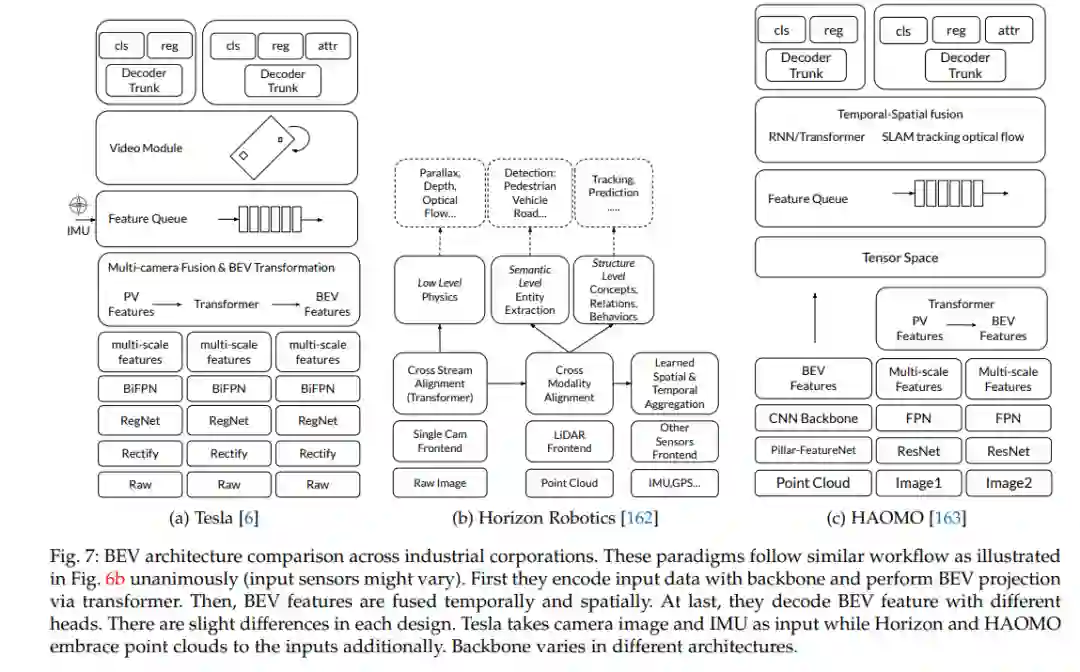 基于以上三个方面的讨论,总结出BEV感知研究具有巨大的潜在影响,值得学术界和产业界长期关注并投入大量精力。与最近关于三维物体检测的研究[19,20,21,22,23]相比,我们的研究不仅在更高的层次上总结了最近的BEV感知算法,并将其形成了一个通用的管道,而且在这种背景下提供了有用的方法,包括基于摄像机和基于LiDAR设置的可靠数据增强、高效的BEV编码器设计、感知头和损失函数族、有用的测试时间增强(TTA)和集成策略等。我们希望这个调研可以成为一个好的起点,为新初学者和当前的研究人员在这个社区有深刻的讨论。