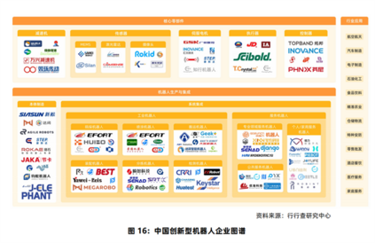 我国机器人行业目前已形成成熟的上下游产业链。阿里云加速器与行行查研究中心 联合推出的中国创新型机器人企业图谱是基于机器人行业产业链框架,梳理出了从零部 件生产到机器人本体集成等各领域的创新型企业代表。 **本体制造方面,**我国创新型企业逐步增多,现阶段处于头部企业与创新企业抢占市场份额的地步,相关创新型企业有思灵机器人、珞石机器人、镁伽机器人等。系统集成方面分为工业机器人与服务机器人,其细分领域也有更多创新型企业涌现,工业机器人集成相关创新型企业有赛那德机器人、极智嘉、埃夫特机器人等。服务机器人集成创新型企业有姜歌机器人、高新兴机器人、玺农科技、海柔创新、擎朗机器人、一米机器人、哇力机器人、狗尾草机器人等。