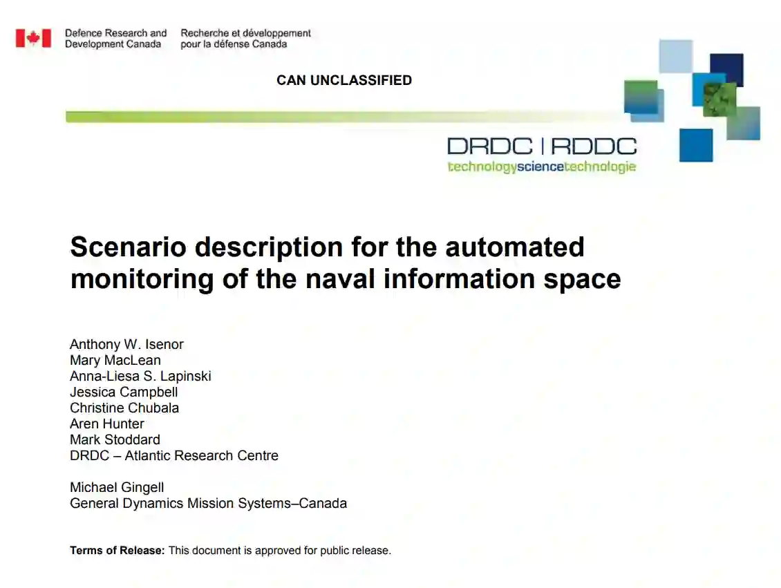 达尔豪斯大学大数据分析研究所、加拿大国防研究与发展部(DRDC)--大西洋研究中心和通用动力任务系统加拿大公司(GDMS-C)成功向加拿大自然科学与工程研究理事会(NSERC)提出了一项提案申请,从而获得了名为 "海军信息空间自动监控(AMNIS)"的为期三年的资助项目。AMNIS 启动会议于 2020 年 10 月 14 日举行,众多教授、国防科学家和 GDMS-C 技术人员参加了会议。会议为三个组织确定了多项行动。与 DRDC 和 GDMS-C 相关的一项行动是需要制定与任务相关的方案,以帮助指导预期的研究。因此,DRDC 率先描述了一个具有代表性的海陆场景,使研究人员能够更好地了解与 AMNIS 相关的潜在研究途径。制定的方案涉及加拿大皇家海军(RCN)和加拿大陆军(CA)执行的一项加拿大人道主义任务。任务是向一个最近遭受自然灾害的国家分发食品和医疗用品。一支敌对兵力还试图窃取这些物资。该场景描述了通过更好的处理技术和决策制定来改进信息流、共享和使用的必要性。该情景旨在引发进一步的讨论,并帮助确定 AMNIS 参与者的研究课题。
