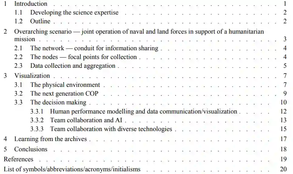其余章节将概述现实场景中的游戏、可视化组件、性能建模、决策制定和学习。每一节都包含一系列问题,这些问题旨在为研究工作提供思考点和指导。第 2 节描述了陆地和海上兵力共同支持人道主义任务的联合行动场景。实现这一目标的方法是通过可能被破坏并存在相关安全风险的节点相互连接和共享信息资源。第 3 节讨论了可视化在场景中的作用及其对决策的影响。这既包括物理环境的可视化呈现,也包括附加信息源的聚合如何影响主题专家的决策。本节还考虑了与人工智能(AI)和各种技术合作进行的人类表现建模。第 4 节讨论如何利用数据档案开发和学习对抗性注入检测方法。第 5 节是本文的结束语。