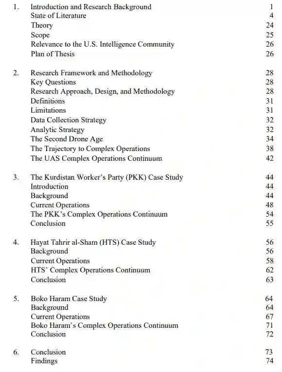 目前的文献认为,恐怖组织未来的无人机系统(UAS)行动威胁有限。本研究的论点恰恰相反。恐怖组织使用无人机系统技术目前只是一种小众威胁。然而,有证据表明,这种威胁将在未来五年内成为主流。本研究采用案例研究法进行定量研究,以证明研究问题。因变量是恐怖分子使用复杂的无人机系统行动。自变量是简单性、供应和规模。研究评估了三个恐怖组织:库尔德工人党、Hayat Tahrir al-Sham 和博科圣地。研究结果表明,获取无人机系统技术很容易,但由于技术限制,扩大行动范围却很困难。此外,报告还指出了当前文献和研究中亟待解决的问题,如组织如何获取上述技术并筹集资金来开发项目。报告还强调了美国和国际社会在应对无人机系统威胁方面取得的进展,同时暴露了立法和法规方面的明显差距。研究的意义表明,美国及其盟国在抵御威胁方面已经落后。