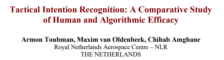 在当代威胁环境中,威胁可能在意想不到的时间从意想不到的角度出现。准确辨别战术意图的能力对于有效决策至关重要。传统的威胁识别策略可能不再适用。本文将探讨如何利用算法识别威胁的战术意图。为此,在模拟实验中比较了人类和算法在识别敌对智能体战术意图方面的功效。在实验中,70 名人类参与者和一个算法在一个海军指挥和控制场景中扮演数据分析师的角色。在该场景中,敌方智能体控制一艘舰艇将拦截多艘友军舰艇中的一艘。数据分析师的任务是及时识别敌方智能体可能攻击的目标。我们对识别的正确性和及时性进行了研究。人类参与者的识别准确率为 77%,平均反应时间为 7 秒。算法的准确率达到了 87%,同时受限于人类的反应时间。当人类参与者识别正确时,算法有 89% 的时间表示同意。相反,当人的反应不正确时,算法有 91% 的时间不同意,这表明决策支持系统有机会在这种情况下影响人的决策。这项研究有助于加深我们对复杂作战环境中的态势感知和决策支持的理解。
