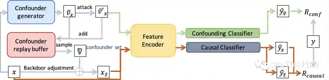 首先,我们需要在攻防的语境下构建一个因果图来描述隐式因子和观测变量之间的联系。我们从数据生成的视角出发,提出了一个自底向上的结构化因果模型 (structural causal model)。如图2所示,我们把隐式因子划分为决定标签的因子 (比如图像中的前景物体的形状)和其他因子 (比如前景物体的纹理),和共同组成了可观测的样本。我们进一步假设和存在着虚假关联,这种虚假关联使得可以通过这条路径来影响,攻击者也就是利用这条路径改变了模型的正确输出。我们引入了域变量,来建模由攻击造成的域迁移对模型的影响。至此,我们可以从因果的视角对攻击和防御的运行原理进行重新阐释:(1) 攻击者通过干预,来影响分布,进而生成攻击样本;(2) 防御方则通过改变分布来提升鲁棒性,诸如跨域模型的集成[1],或者更多的域外数据的加入[2]等;