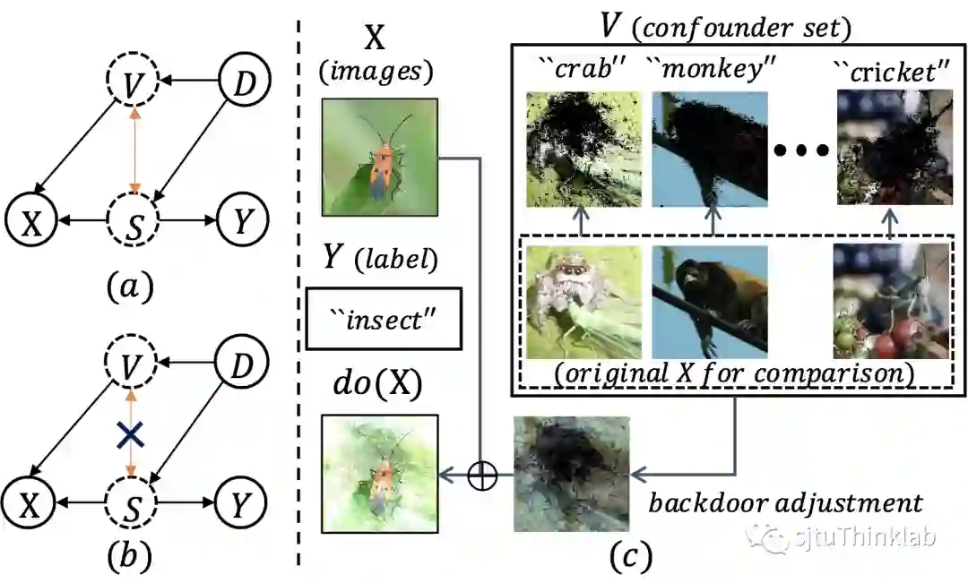 图 2. (a) 域攻击不变因果图;(b) 因果干预下的因果图;(c) 通过后门调整实现的因果干预