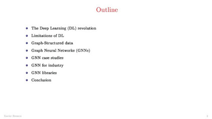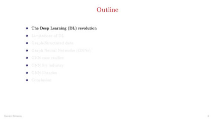 来自新加坡国立大学Xavier Bresson讲述图机器学习课程,The Deep Learning (DL) revolution Limitations of DL Graph-Structured data Graph Neural Networks (GNNs) GNN case studies GNN for industry GNN libraries Conclusion