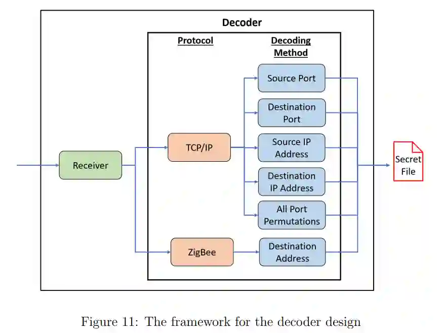 这项研究设计了一种新颖的物联网隐蔽定时通道(CTC),将数据编码到已有的网络信息(即端口或地址)中。在两种物联网协议--传输控制协议/互联网协议(TCP/IP)和 ZigBee 之间实现了七种不同的编码方法。TCP/IP 隐蔽信道是通过模仿 Ring 智能门铃创建的,并使用亚马逊网络服务(AWS)服务器生成流量。ZigBee 通道是通过复制飞利浦 Hue 照明系统建立的,并在局域网 (LAN) 上执行。此外,CTC 可在两种不同模式下实施: 隐身和带宽。性能用吞吐量和可探测性来衡量。隐形方法模仿合法流量捕获,使其难以检测,而带宽方法则放弃了这种方法,以获得最大吞吐量。检测结果采用了四种基于统计的检测测试:Kolmogorov-Smirnov(KS)测试、形状测试、规律性测试和相似性测试。
