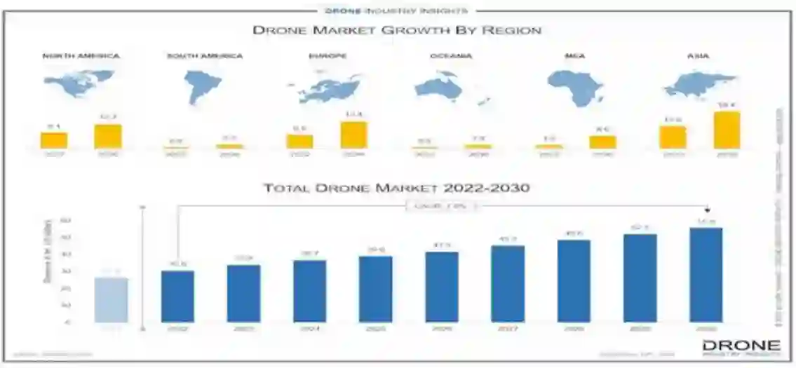 采购军用无人机的竞赛已经波及南亚。印度长期以来一直渴望获得配备智能炸弹和空对地导弹的远程捕食者无人机。印度通常依赖以色列获取无人机技术。印度正将大量军事预算用于购买无人机和弹药。最近,印度投资约 39.9 亿美元从美国采购了配备 MQ-9B 捕食者武器的无人机。这些无人机配备地狱火导弹和智能炸弹,专为远程高空作业而设计。它们可用于加强印度在印度洋地区的监视能力。印度空军新增了四架新型苍鹭 Mark-2 无人机,它们可在空中停留 36 小时以上,并可沿巴基斯坦和中国边境实施打击和监视。由于两国互不信任,印度在无人机等新兴技术方面的进步令巴基斯坦十分担忧。本图显示了 2022 年至 2030 年全球无人机按地区划分的出货量。根据这项研究,亚洲是增长最快的市场,欧洲和北美紧随其后。