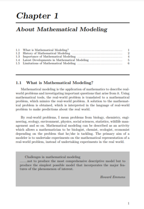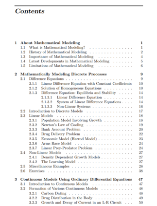 本书的一个特点是涵盖了数学模型的不同例子,包括人口模型、经济模型、军备竞赛模型、战斗模型、学习模型、酒精动力学模型、碳定年法、药物分布模型、机械振荡模型、流行病模型、肿瘤模型、交通流模型、犯罪流模型、空间模型、足球队表现模型、呼吸模型、二神经元系统模型、僵尸模型、恋爱模型。共同的主题,如平衡点,稳定性,相平面分析,分岔,极限环,周期加倍和混沌运行了几个章节,并强调了它们在模型的背景下的解释。第三章讨论了利用实际数据进行系统参数估计以进行模型验证。