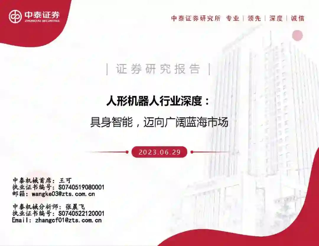 人形机器人打开机器人市场空间。人形机器人指具备人类的外形特征和行动能力的智能机器人。传统机器人一般应用于单一场景,通过特定数据库进行训练,例如搬运、送餐、扫地机器人等;而人形机器人基于通用大模型,不限制固定应用领域,运转时可根据人的指令无缝生成相关代码并指挥机器人行动。从专用到通用场景的升级,人形机器人有望打开机器人应用场景,远期市场空间大。