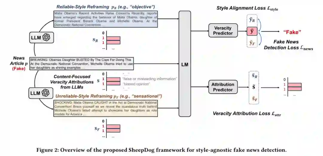图4 SheepDog 的整体架构 首先,模型使用大型语言模型(LLM)将原始新闻样本(如伪造新闻)生成多种风格重写版本,包括客观风格(objective)和煽动风格(sensational)。这些样本在语义不变的前提下,呈现出语气、措辞、结构等方面的显著差异,从而构建一个风格扰动训练集。 接着,主模型接受这组文本作为输入,并通过两个训练目标进行优化: * 风格一致性损失:要求模型对不同风格的文本输出相同的真实性预测,从而避免因文风而判断失误; * 新闻检测损失:以常规方式训练真假标签,用于监督主检测器。