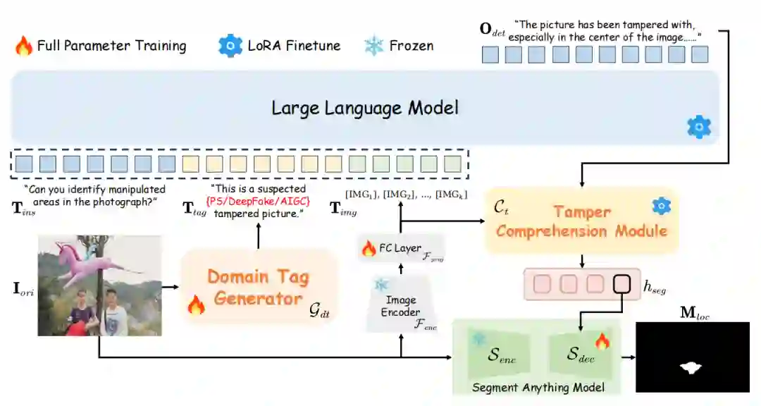 为应对高保真、多模态、语义伪装等复杂伪造内容,FakeShield 提出了一种集检测、定位与解释于一体的多模态大模型驱动框架。如图6所示,FakeShield的核心由三个子系统组成,分别对应“判别”“解释”“定位”三个阶段: