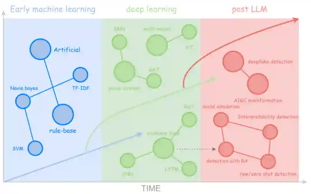 图1:虚假信息样例 作为信息不对称问题在数字时代的集中体现,虚假信息的生成与传播呈现出自动化程度高、隐蔽性强、跨平台传播快等新特征,其技术演化也具备阶段性(如图2所示):从早期机器学习(如朴素贝叶斯、TF - IDF 等),到深度学习(GNN、LSTM、ViT),再往后大语言模型(post - LLM)时代,正朝着深度伪造检测、AIGC 虚假信息识别等方向发展。高效、精准地识别虚假信息,并抑制其链式扩散,已成为自然语言处理、社会计算与人工智能安全等交叉领域的关键研究任务。