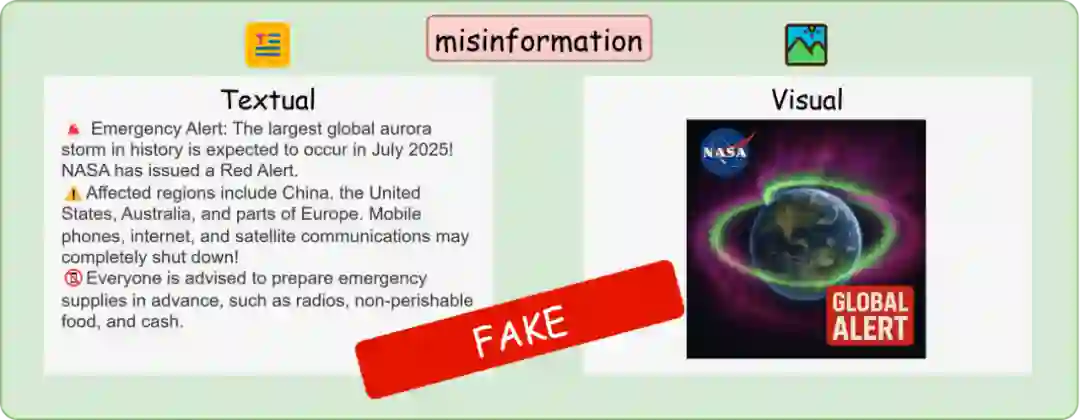 在随着社交媒体和在线平台深度嵌入日常生活,信息传播的速度与规模达到了前所未有的水平。然而,这一高度互联的传播机制也加剧了虚假信息(misinformation)在多领域的扩散风险。无论是未经证实的谣言、经过篡改的图文或伪装成正规报道的假新闻(如图1所示,虚构“2025 年 7 月将发生史上最大全球极光风暴,NASA 发布红色警报,影响多地区通信并需准备应急物资” ,还搭配伪造含 NASA 标识与 “GLOBAL ALERT” 视觉素材这类典型案例 ),这些误导性内容正持续侵蚀公众的认知信任,干扰舆论环境,甚至威胁社会稳定。