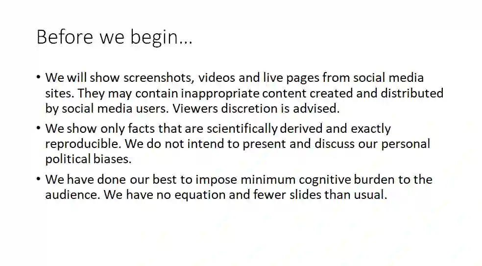 报告摘要:社交机器人已经存在了十多年了。 社交机器人可以摇摆政治见解,散布虚假信息并招募恐怖组织。 社交机器人通过采用情感,同情跟随,同步删除和轮廓转换来使用各种复杂的技术。 文献中提出了几种检测,探索和衡量社交机器人的方法。 我们将从数据挖掘和机器学习的角度对现有工作进行全面概述,讨论各种方法的相对优势和劣势,为研究人员和从业人员提供建议,并为驯服社交机器人的未来研究提出新的方向。 本教程还将讨论在社交机器人上收集和共享数据的陷阱。