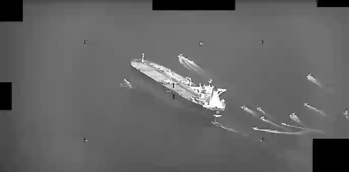 图:美国海军的视频截图显示,2023 年 5 月,伊朗 IRGCN 快速攻击艇在霍尔木兹海峡接近悬挂巴拿马国旗的油轮 Niovi。这一事件凸显了快速移动、蜂拥而至的空中和水面飞行器所带来的威胁。 图片来源:美国海军