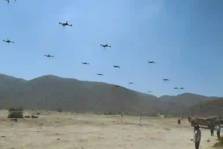 2019 年 5 月 8 日,第 11 装甲骑兵团和威胁系统管理办公室在国家训练中心操作由 40 架无人机组成的蜂群。蜂群行动需要复杂的 C2 来管理各种不同的组件。 图片来源:美国陆军/Pv2 James Newsome