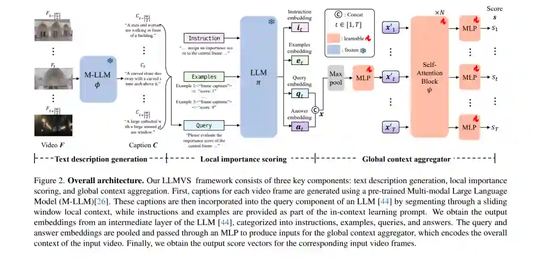 为应对这一挑战,本文提出了一种全新的视频摘要框架,充分利用近年来大语言模型(Large Language Models, LLMs)的强大能力。我们预期,LLMs从海量数据中学习到的丰富知识能够以更贴近人类语义理解与主观判断的方式评估视频帧,从而有效缓解关键帧选取过程中固有的主观性问题。