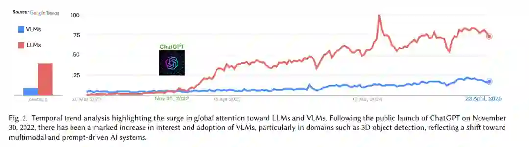 尽管基于点云处理的传统3D物体检测方法(通常基于卷积神经网络(CNN))已经取得了一定的进展,但这些方法仍然面临语义理解、数据效率和适应性方面的关键限制。如前所述,基于CNN的3D检测器通常需要昂贵的传感器校准、大规模注释数据集和严格的重新训练程序来适应新环境。更重要的是,它们缺乏复杂推理任务所需的语义可解释性,例如识别特定物体属性或响应用户定义的自然语言提示。 近年来,VLMs已成为解决传统2D和仅基于几何的3D物体检测方法固有局限性的变革性解决方案。VLMs将计算机视觉的视觉模式识别优势与大规模语言模型(LLMs)的语义推理能力相结合,能够对场景进行更丰富的多模态理解[Ma等,2024]。如图2所示,2022年11月30日ChatGPT的公开发布,引发了对LLMs前所未有的兴趣,迅速将它们确立为自然语言理解的基础工具。虽然VLMs的崛起较为渐进,但LLMs的影响促使了对多模态系统的关注增加。这种增长的兴趣在需要高层次推理和上下文理解的领域中尤为明显,如机器人技术中的3D物体检测、增强现实和自动导航。与传统的3D检测器不同,VLMs使得灵活查询、少量示例学习或零-shot学习以及语义任务泛化成为可能——这一切都无需为每个新任务重新训练。