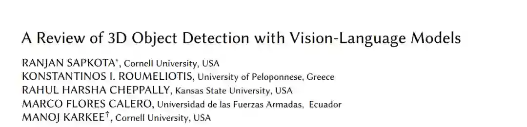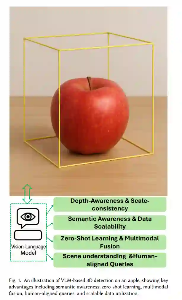 图1提供了一个视觉示例,展示了物体检测如何从传统的2D方法发展到更先进的3D检测技术。图像显示了一个苹果在3D空间中的检测,使用的边界框不仅捕捉了物体在X轴和Y轴上的位置,还捕捉了它的深度(Z轴)。这突出了3D检测的核心优势:比起限于平面图像坐标的2D方法,3D检测能够更准确地感知和定位物体在空间环境中的位置。如图所示,2D边界框无法完全表示物体的体积、大小或它与附近物体的关系,这些都是机器人操作或自主导航等任务中重要的因素。 物体检测本身是计算机视觉中的基础任务,广泛应用于自动驾驶、机器人、监控和增强现实等领域[Ghasemi等,2022]。其主要目标是通过在图像或传感器数据中绘制带有类别标签的框,识别和定位有意义的物体[Zou等,2023]。传统的物体检测系统主要依赖于2D图像,早期的模型使用手工特征[Agarwal和Roth,2002;Papageorgiou等,1998]。深度学习的现代突破导致了实时检测器的出现,如YOLO[Redmon等,2016]、SSD[Liu等,2016]和Faster R-CNN[Ren等,2016],即使在复杂的条件下也能实现高精度[Sapkota和Karkee,2024;Sapkota等,2024c]。然而,没有深度信息,这些2D系统在需要空间推理或在3D世界中进行物体交互的任务中表现欠佳。 为克服这些空间限制,3D物体检测方法逐渐得到了越来越多的关注,这些方法操作的是体积数据,如LiDAR点云、深度图和RGB-D输入[Wang等,2021]。这些模型提供了更完整的物体几何和空间关系表示,通常利用体素化、基于点的表示或3D卷积[Arnold等,2019;Caglayan和Can,2018]。然而,尽管这些传统的3D深度学习模型在空间推理方面提供了显著的改进,但它们也有自己的约束[Qian等,2022;Wang等,2022c]。它们需要大量的注释[孟等,2021;Xiang等,2014],需要大规模的3D数据集和详细的人工标签,而这些标签的创建既昂贵又费时[Brazil等,2023;Sølund等,2016;Tremblay等,2018]。此外,它们常常在跨领域泛化方面表现不佳[Eskandar,2024],缺乏语义灵活性[Zhang等,2021],并且在适应新物体类别或部署环境时,训练要求也非常严格[Mao等,2023;Peng等,2015]。进一步 complicating 它们的部署,传统模型往往依赖于传感器,依赖于精心校准的多模态系统,如LiDAR-摄像头融合系统[Alaba和Ball,2022],这使得它们在无控制或资源受限的环境中表现得较脆弱。 此外,这些系统在可解释性和灵活性方面也存在局限[Wang等,2022a],缺乏融入高层次、任务导向指令的能力[Chen等,2023a]。例如,它们无法理解像“只检测离手边的熟透苹果”这样的命令,也无法实时适应不断变化的任务目标或用户意图。视觉-语言模型(VLMs)的出现提供了一个具有变革性的解决方案,通过结合视觉感知和自然语言理解,VLMs为3D物体检测引入了全新的语义推理层次。如图1所示,我们的示例展示了一个现实世界中的苹果在3D空间中被检测出来,不仅具备空间精度,还通过语义理解得到了上下文的注解。该图还突出了双重优势:直接3D检测相较于2D方法的五大优点,以及VLM-based 3D检测系统相比传统CNN-based 3D检测器提供的五大独特优势。直接的3D检测方法通过提供更高的空间精度、深度感知定位、体积上下文、遮挡处理和度量尺度推理,超越了它们的2D对应物。这些能力对于现实世界的机器人应用至关重要,因为它们需要对物体的位置和交互有全面的理解。与此同时,基于VLM的方法进一步提升了这些能力,通过启用基于提示的控制[Tang等,2025b]、零-shot泛化[Zhang等,2024c]、语义意识[Zhang等,2024f]、多模态集成[Zang等,2025]和可解释性[Raza等,2025;Yellinek等,2025]。与基于CNN的系统不同,VLMs可以处理自然语言查询并将高层次推理整合到检测过程中[Chen等,2024d;Fu等,2025],允许执行像“找到适合采摘的最近苹果”这样的任务,而无需针对每个新任务进行特定的训练。