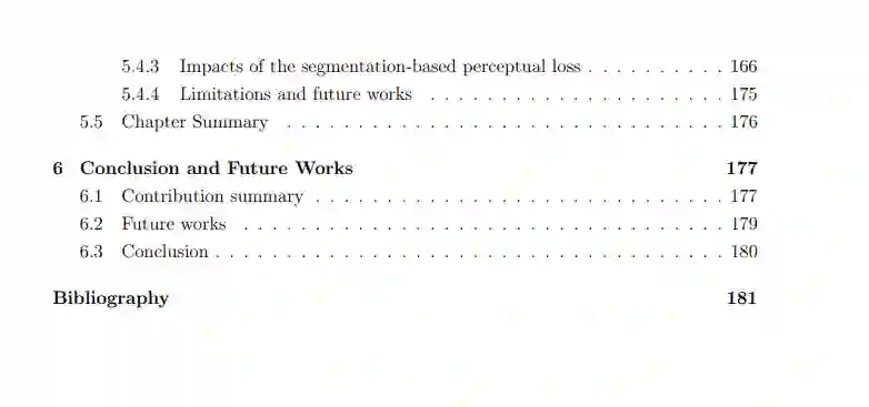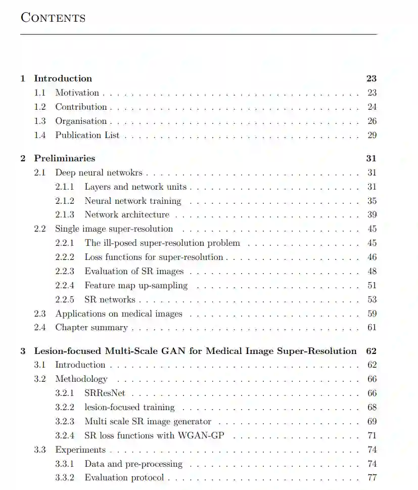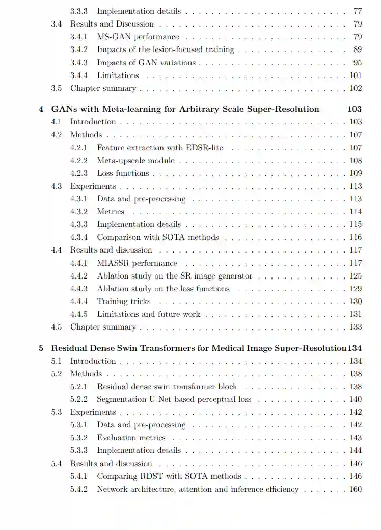 总之,这篇论文代表了我在应用深度神经网络进行稳健的医学图像超分辨率任务方面的研究贡献,包括高效的网络架构、广泛适用的训练技术和具有临床意义的图像质量评估。在出版时,这些提出的方法在各种公共和私有医学图像数据集的模拟实验中表现出最先进的性能。这些算法有可能在医院中应用于先进的临床流程,具有适当的特定案例修改和补充技术。此外,超分辨率的新方法和发现还可能有助于其他低级图像处理任务,而讨论和消融研究提供了令人兴奋的未来研究方向。
