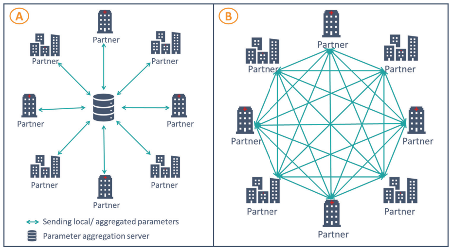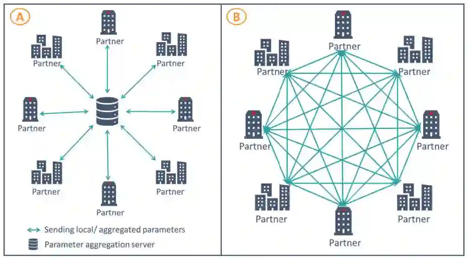 数据是推动科研领域和工业领域人工智能发展的关键要素。在这种情况下,可用于训练和验证 AI 模型的优质数据越多,从中得出的结果就越准确。出于这个原因,数据收集和共享是每个人工智能项目的重要组成部分。然而,最近保护个人数据的法律和道德考虑因素,例如欧洲通用数据保护条例 (GDPR) 和美国的健康保险可移植性和责任法案 (HIPAA),使得数据收集过程具有挑战性、耗时且成本高昂 [8, 9]。从分布式数据中学习的多中心人工智能研究有可能应对这些挑战。这种方法被称为分布式学习,其中以机器学习或深度学习模型为特征的 AI 模型,从分布在合作伙伴网络中的孤立数据中迭代或同时学习 [10-13]。分布式学习可以在保护隐私的同时实现大规模数据访问。文献中报道的传统分布式学习框架(在本论文之前)都依赖于一个中央服务器来协调网络中的学习。这种设计存在1)信任问题,因为所有合作伙伴都需要盲目信任管理服务器的实体,2)源于模型中心化的可追溯性问题,因此合作伙伴没有透明的监控系统来评估其余网络合作伙伴的参与。
