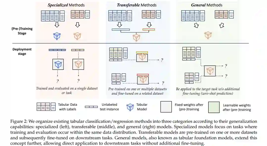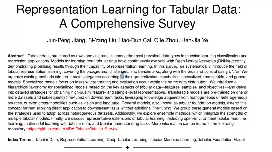 摘要—表格数据以行和列的形式组织,是机器学习分类和回归应用中最常见的数据类型之一。用于从表格数据中学习的模型不断发展,近年来深度神经网络(DNNs)通过其表示学习能力展现出了良好的效果。在本综述中,我们系统地介绍了表格表示学习领域,涵盖了背景、挑战和基准测试,以及使用深度神经网络的优缺点。我们根据模型的泛化能力,将现有方法组织为三大类:专用模型、可迁移模型和通用模型。专用模型专注于训练和评估在同一数据分布下进行的任务。我们基于表格数据的关键方面——特征、样本和目标——提出了专用模型的层次化分类法,并深入探讨了获取高质量特征和样本级表示的详细策略。可迁移模型在一个或多个数据集上进行预训练,然后在下游任务中进行微调,利用从同质或异质来源,甚至是跨模态(如视觉和语言)中获取的知识。通用模型,也称为表格基础模型,进一步扩展了这一概念,允许在不额外微调的情况下直接应用于下游任务。我们根据跨异构数据集适应的策略,将这些通用模型进行了分类。此外,我们还探讨了集成方法,整合了多种表格模型的优势。最后,我们讨论了表格学习的代表性扩展,包括开放环境下的表格机器学习、表格数据的多模态学习和表格理解任务。更多信息请参见以下存储库:https://github.com/LAMDA-Tabular/Tabular-Survey。 关键词—表格数据、表示学习、深度表格学习、表格机器学习、表格基础模型
