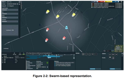 根据收集到的文献,定义了四种群组可视化的布局。这些都是在原型人机界面中实现的。可视化的重点是战斗管理系统中的蜂群。人机交互是通过传统的显示器和鼠标/键盘或触摸控制实现的。首先,介绍了四个布局,之后解释了不同的组件。