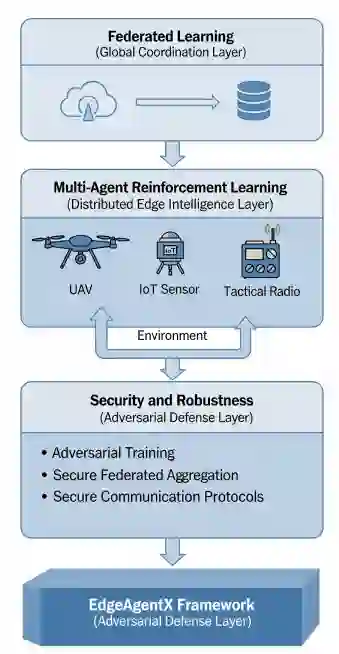 图1. EdgeAgentX的概念架构展示了三层设计——联邦学习协调层(全局层)、多智能体强化学习层(分布式边缘智能层)和对抗防御层(安全与鲁棒层)。