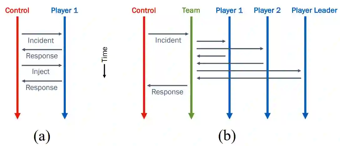图 2:Snow Globe 多智能体系统的软件架构示例。垂直箭头代表智能体,水平箭头代表 (a) 简单桌面演练和 (b) 团队制定集体应对措施的信息流。