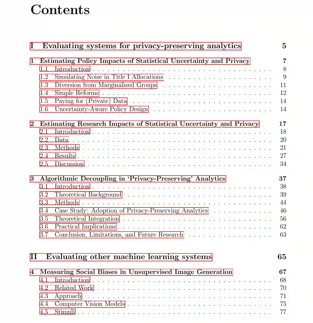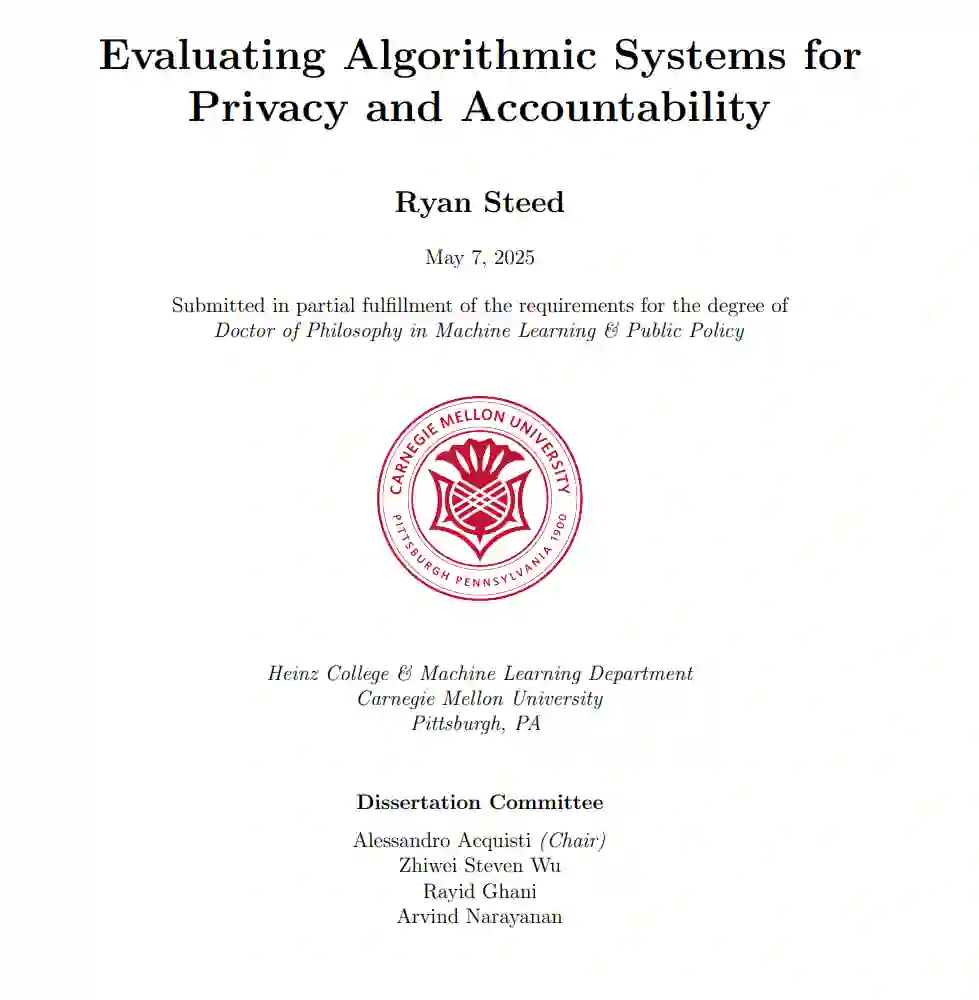 机器学习算法及其他统计技术被广泛应用于利用个人信息进行推断,但为此目的构建的系统可能对隐私和社会公平造成不利影响。近期研究提出了旨在在保护个人隐私的同时完成这些推断的技术。本文综述旨在:1)开发评估机器学习系统及“隐私保护”分析方法社会影响的途径;2)理论化这些评估在追究机器学习系统设计者和运营者责任中的作用。 第一部分聚焦于旨在保护隐私的机器学习及其他分析系统技术的影响。第一章评估了差分隐私公共人口普查统计数据对基于证据的政策的影响,发现尽管统计不确定性导致教育资金分配上的不平等,但为保护隐私而注入的噪声可能远小于现有数据误差的影响(Steed, Liu 等,2022)。第二章量化了噪声对大量社会科学研究关键发现的影响。第三章基于定性访谈,构建了隐私保护分析方法采纳的扎根理论,揭示了采纳组织如何可能将对隐私的认知与其具体实施细节相分离的过程(Steed & Acquisti,2025)。 第二部分探讨了评估机器学习系统社会公平性的途径,以及将评估作为问责机制的应用。第四章提出了一种量化图像嵌入中刻板印象关联的方法,并展示了无监督图像生成模型自动学习到种族、性别及交叉偏见(Steed & Caliskan,2021)。第五章对人工智能(AI)审计工具的数据集进行了分类,并访谈了35位审计从业者,发现从业者在AI问责所需工具——包括危害发现与倡导工具——方面资源较为匮乏(Ojewale 等,2025)。 算法系统,尤其是机器学习(ML)系统,在隐私和社会公平方面引发了严重的社会关注。这些系统被用于金融、刑事司法、医疗保健以及内容审核等重要决策领域;但往往,这些系统无法正常运行(Raji, Kumar 等,2022)。它们基于通过大规模社会经济监控机制收集的海量个人数据,对个体进行统计推断(Zuboff,2019;Cohen,2019;FTC工作人员,2024);这一安排持续加剧了歧视、不平等及其他社会危害(Benjamin,2020;Skinner-Thompson,2020)。面对隐私问题,组织纷纷采用更多算法技术以在执行统计分析的同时保护个人隐私;虽然理论上具有前景,但这些“隐私保护”技术的实际影响尚不确定。 防止和纠正算法系统的不利影响部分依赖于持续且有影响力的实证评估。本文综述旨在:1)开发评估机器学习系统及“隐私保护”分析方法社会影响的途径;2)理论化这些评估在追究机器学习系统设计者和运营者责任中的作用。 本文的研究成果融合了当代技术政策中的两个关键领域:数据隐私和“人工智能”(AI)问责。成熟的信息隐私和数据保护机制——尤其是在欧盟——侧重于通过限制组织处理个人数据的方式来维护个人隐私权。各行各业及政府部门正率先部署差分隐私、联邦学习等方法,以协调依赖统计推断的商业模式与现代隐私法规及消费者对隐私的诉求。但这些技术在理论和实施上均较为复杂,其在隐私和数据保护政策中的角色仍未明朗。第一部分探讨了这些“隐私保护”系统的采用及其影响。 相比之下,专门针对AI系统社会影响的监管尚不成熟。但政策关注度显著提升,尤其是在应对使用机器学习技术生成文本和图像的产品热度时。美国和欧洲最近的政策提案及已实施的立法,特别强调将独立评估算法系统作为问责机制:即根据社会期望对算法系统性能作出重要判断的能力(Birhane 等,2024)。第二部分聚焦于AI审计的实践。