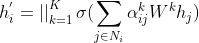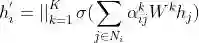 俗话说“一个篱笆三个桩,一个好汉三个帮”,GAT也秉承了这种思想,采用多头注意力机制(multi-head attention)来捕获邻居节点在不同的方面对中心节点影响力的强弱。我们将K 个head分别提取的节点特征表示进行拼接作为最终的节点表示: