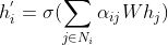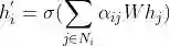 利用上面计算所得的注意力系数对邻居节点的特征V进行线性组合作为中心节点的特征表示: