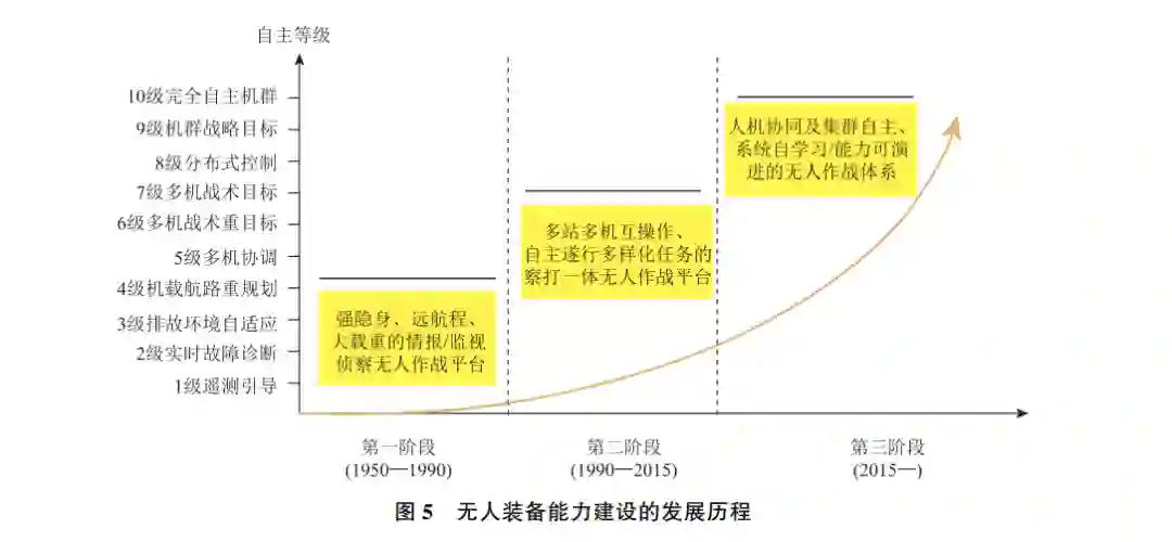 无人平台作为新质作战力量在军事行动中日益发挥重要作用,本文围绕打造智能化、无人 化作战能力需求,从战略、战役、战术和技术等层面分给出了构建无人作战体系的必要性,在总结凝 练无人装备发展历程和技术发展趋势基础上,探索提出了构建“以天基为核心、空基为主导、陆海 基协同发展”的无人作战体系构想和路线图,分析梳理了支撑无人作战体系发展理论和应用的研 究方向和关键技术群,对智能化战争新形势下的无人作战体系建设发展具有参考意义。随着人工智能、无人系统等新兴技术发展,“飞 者非鸟、潜者非鱼”的无人化、智能化战争形态已经 拉开大幕,察打一体式、集群自杀式等各种无人作战 装备在众多国际冲突和战争中大显身手,在情报收 集、火力支援、通信中继、打击评估等方面发挥了重 要作用[1] 。 面对新的形势和国家战略需求,打造新型国防 战略体系架构与战略能力,夯实新质力量要素和运 用发展模式,以崭新视角和前瞻思维探索适应新时代 的制胜哲学与作战理念,研究构建具有自身特色的无 人作战体系,对牵引装备体系发展具有现实意义,同时 也是新时期军事斗争的重大迫切亟需。