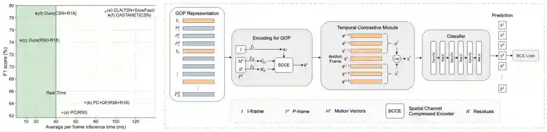 为此,论文提出了 SCCP(Spatial Channel Compressed Encoder)模块。对于关键帧,在完全解码后使用常规骨干网络提取特征;对于非关键帧,通过使用运动向量和残差以及对应的关键帧特征在轻量级的网络上提取非关键帧的高质量特征;同时利用 Temporal Contrasitive 模块实现端到端的训练和推理。