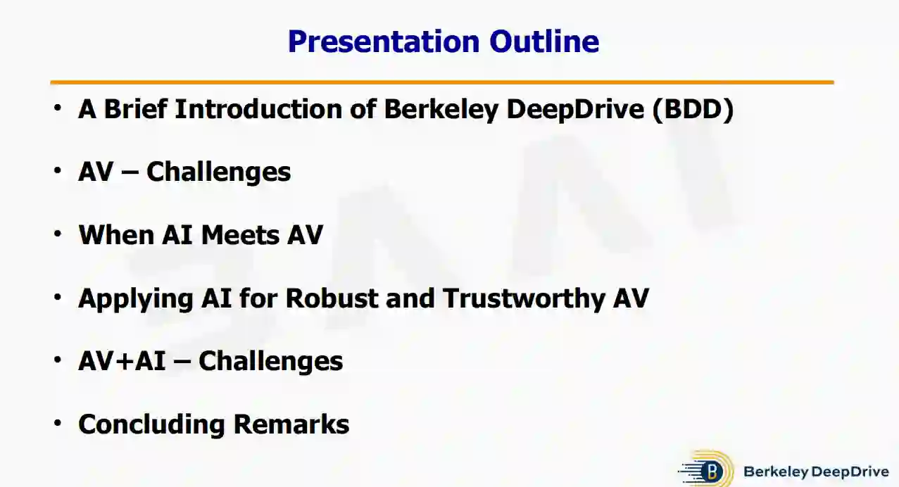 AV与AI相遇会产生怎样的效果不禁令人期待。人类驾驶汽车与无人驾驶相比,人类司机存在着缺陷,而且目前AV面临着技术、安全问题、市场接受度和法律等问题,此次报告主要从以下方面讲述了AV+AI的挑战与机遇: