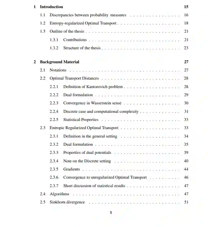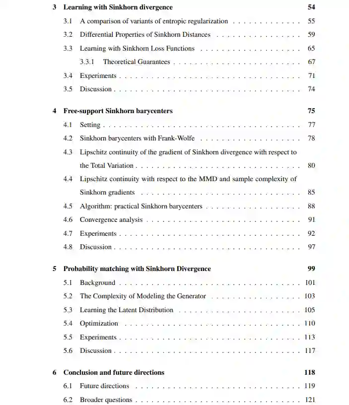 在这篇论文中,我们针对这些问题,集中在三个主要设置,熵最优传输已被使用:学习直方图在监督框架,重心估计和概率匹配。我们提出了第一个在有监督的情况下学习Sinkhorn损失的一致估计,有明确的超额风险界限。我们提出了一个新的Sinkhorn质心算法,处理具有可证明的全局收敛保证的任意概率分布。最后,我们用Sinkhorn散度作为损失函数来处理生成模型:我们从建模和统计的角度分析潜在分布和生成器的作用。我们提出了一种联合学习潜在分布和生成器的方法,并刻画了该估计量的泛化性质。总之,在这项工作中开发的工具有助于理解熵最优输运的理论性质及其在机器学习中的通用性。