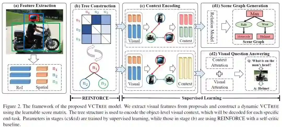 摘要:我们提出组合动态树结构,将图像中的对象放入视觉上下文中,帮助进行视觉推理任务,如场景图生成和视觉问答。我们的视觉上下文树模型(称为VCTree)与现有的结构化对象表示(包括链和全连接图)相比具有两个关键优势:1)高效且富有表现力的二叉树编码对象之间固有的并行/层次关系,例如“衣服”和“裤子”通常是共同出现的,属于“人”; 2)动态结构因图像和任务而异,允许在对象之间传递更多特定于任务的内容/消息。为了构造一个VCTree,我们设计了一个score函数来计算每个对象对之间的任务依赖效度,这个VCTree是score矩阵中最大生成树的二进制版本。然后,视觉上下文由双向TreeLSTM编码,并由特定于任务的模型解码。本文提出了一种混合学习方法,将末端任务监督学习与树形结构强化学习相结合,前者的评估结果作为后者结构探索的self-critic。两个benchmark测试的实验结果,需要对上下文进行推理:用于场景图生成的Visual Genome和用于视觉Q&A的VQA2.0,表明VCTree在发现可解释的视觉上下文结构时优于最先进的结果。
