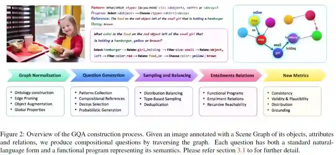 摘要:我们介绍了一个新的数据集GQA,用于真实世界的视觉推理和合成问题回答,试图解决以前的VQA数据集的关键缺陷。我们开发了一个强大而健壮的问题引擎,它利用场景图结构创建了2200万个不同的推理问题,所有这些问题都带有表示其语义的功能程序。我们使用这些程序来获得对答案分布的严格控制,并提出了一种新的可调平滑技术来减少问题的偏差。随数据集而来的是一套新的度量标准,用于评估consistency、grounding和plausibility等基本质量。对baseline和最先进的模型进行了广泛的分析,为不同的问题类型和拓扑提供了细粒度的结果。一个单独的LSTM仅获得42.1%的结果,强大的VQA模型达到54.1%,而人类的表现最高达到89.3%,这为探索新的研究提供了充足的机会。我们强烈希望GQA能够为下一代模型提供支持资源,增强健壮性、改进一致性以及对图像和语言更深入的语义理解。