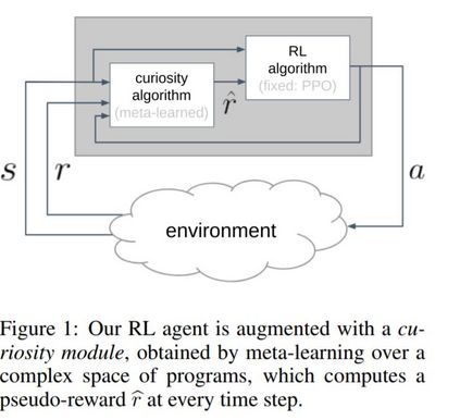我们假设好奇心是进化过程中发现的一种机制,它鼓励个体在生命早期进行有意义的探索,从而使个体接触到能够在其一生中获得高回报的经历。我们将产生好奇行为的问题表述为元学习的问题之一:一个外环将在一个好奇心机制的空间中搜索,该机制动态地适应代理的奖励信号,而一个内环将使用适应的奖励信号执行标准的强化学习。然而,目前基于神经网络权值传递的meta-RL方法只在非常相似的任务之间进行了推广。为了扩展泛化,我们提出使用元学习算法:类似于ML论文中人类设计的代码片段。我们丰富的程序语言将神经网络与其他构建模块(如缓冲区、最近邻模块和自定义丢失函数)结合在一起。我们通过实验证明了该方法的有效性,发现了两种新的好奇心算法,它们在图像输入网格导航、acrobot、lunar lander、ant和hopper等不同领域的性能与人类设计的公开发布的好奇心算法相当,甚至更好。